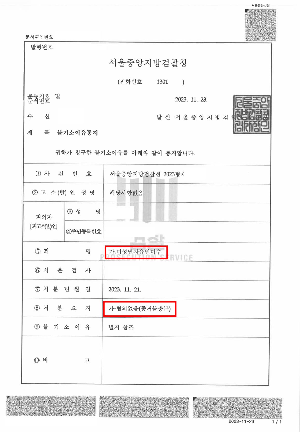 불기소이유통지서(혐의없음 증거불충분)-(미성년자 약취유인미수) 초등학생을 유괴하려한 자 2025.07.15