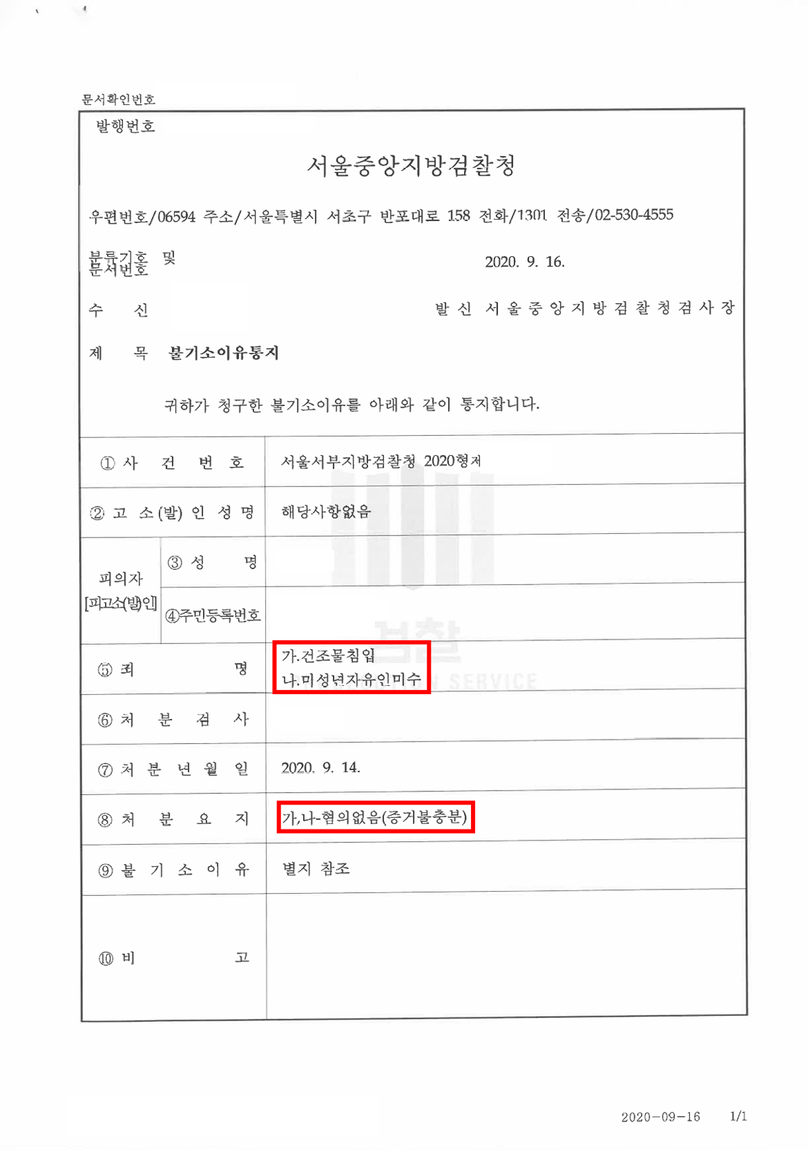 불기소이유통지서(혐의없음)-건조물침입 및 미성년자 유인미수 2025.07.15