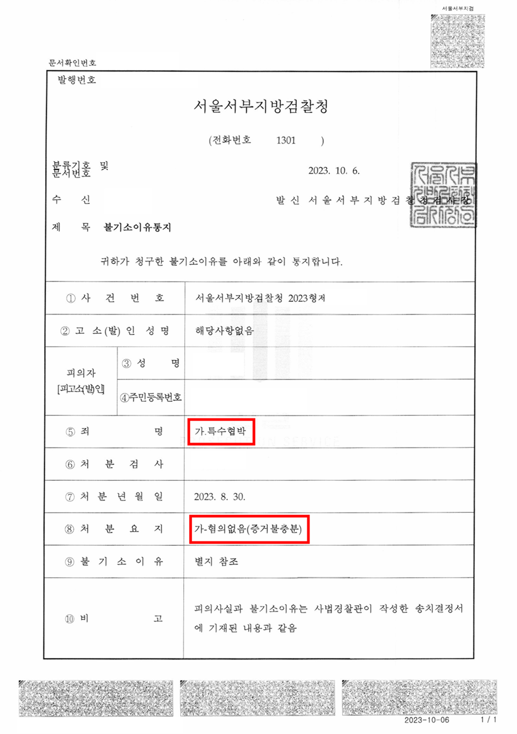 불기소이유서(특수협박-존속상해 협박) 혐의없음 증거불충분 2025.07.08